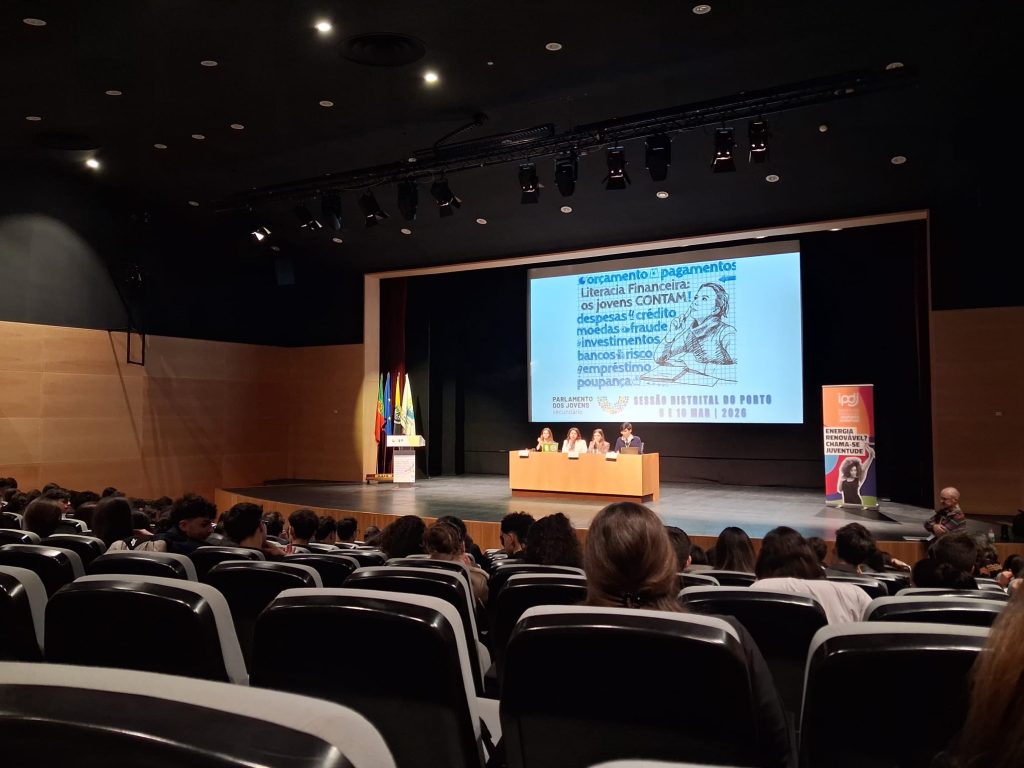 Os alunos Maria Inês Santos Cunha Silva e Miguel Silva Correia Amaral Mendes participaram na Sessão Distrital do Programa Parlamento dos Jovens 2026, que decorreu no Auditório Municipal de Vila Nova de Gaia e reuniu representantes de 66 escolas do distrito do Porto.